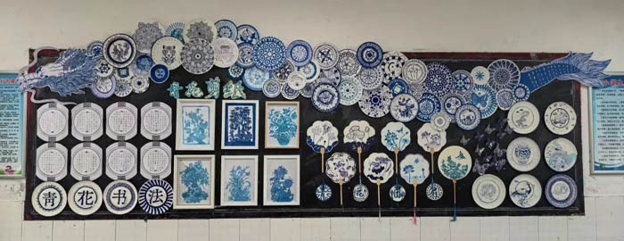 青花之美,在于其素雅中的典雅,简约中的深邃。“青花古韵”博物馆以蓝白为主色调,营造出清新雅致的氛围。同学们创作的青花主题手作,从纸盘上的“青花”文字装饰,到充满创意的青花图案设计,将传统青花瓷的纹饰元素与现代艺术表现形式巧妙结合。“白如玉,明如镜,薄如纸,声如磬”,展区的文字介绍让同学们对青花瓷的特点一目了然,在欣赏与创作中,非遗瓷艺的魅力被重新诠释,东方美学的种子在年轻心灵中悄然萌发。