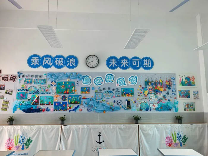 走进教室,“乘风破浪”“未来可期”的标语下,一整面墙被蓝色纱幔、贝壳、船舵等元素铺满,仿佛闯入真实海洋:手工区里,孩子们用黏土捏出的章鱼、小丑鱼色彩鲜亮,立体生态瓶里珊瑚摇曳;知识区的“海洋生物小百科”“捕鱼小知识”,是大家查阅资料后手绘的科普卡;互动区的“‘鱼’你同乐”渔网挂着彩绘鱼形卡片,写满了孩子们对海洋的奇思妙想——“鲸鱼会打喷嚏吗?”“珊瑚是动物还是植物?”