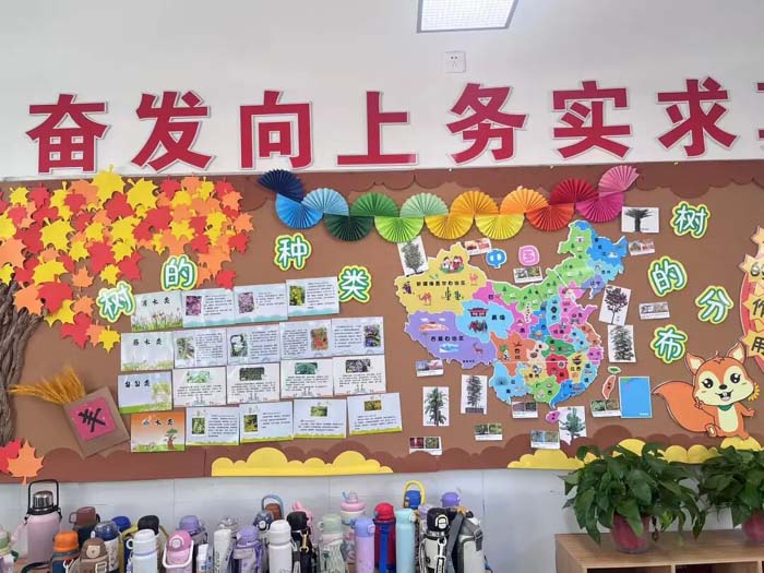 “树的种类与分布”博物馆宛如一座灵动的自然课堂。五彩斑斓的树叶装饰出秋日的烂漫,中国地图上标注着各类树木的分布,一旁的树种介绍详细又生动。在这里,同学们化身自然观察员,将对树木的认知转化为精美的科普作品,让“奋发向上”的成长力量,在对一草一木的探究中,延伸出对生态家园的守护之责。