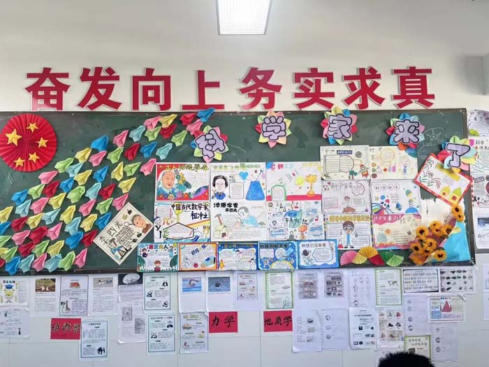 “科学家来了”博物馆如同一座微型科学殿堂。彩色纸飞机组成的“科研征途”,搭载着祖冲之、李四光等古今科学家的故事,他们的科研精神在同学们的手抄报中熠熠生辉。下方的“动物学”“力学”“地质学”知识板块,将复杂的科学原理拆解为通俗的图文,仿佛是一套套科学密码,等待着参观者去破译。在这里,同学们以笔为刃,剖开科学的神秘面纱,让“奋发向上
