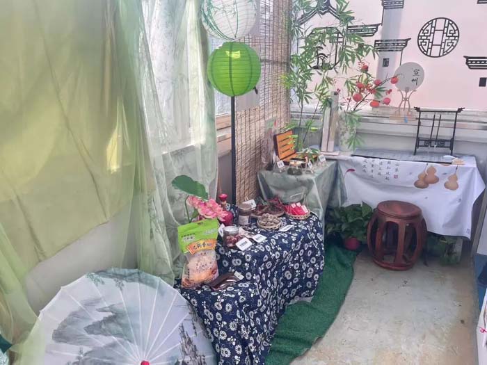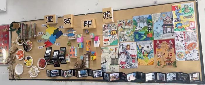 走进校园,“宣城印象”博物馆率先映入眼帘。色彩斑斓的宣城地图,标注出宣州、郎溪、泾县等区域,仿佛在邀请同学们踏上一场文化溯源之旅。精致的纸艺建筑模型,复刻了宣城的特色民居,一砖一瓦都尽显匠心;胶片式的照片展示,将敬亭山的秀丽、谢朓楼的古朴一一定格,让人身临其境。还有那充满烟火气的民俗手作,从传统美食到特色工艺,全方位呈现宣城的在地文化,让同学们在校园中便能触摸家乡的文化脉搏,厚植乡土情怀。