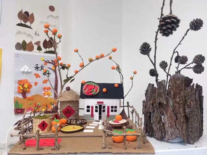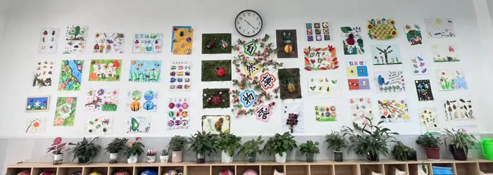 “自然博物馆”宛如一座微型生态艺术乐园。这里有树叶拼贴的树木、花朵,种子黏贴的昆虫、植物,还有黏土制作的小动物、彩虹景观。蝴蝶标本与艺术创作的结合,让自然之美在艺术加工下更显灵动;“昆虫记”“森林太阳”等主题作品,展现了同学们对自然生命的细致观察与奇思妙想。
