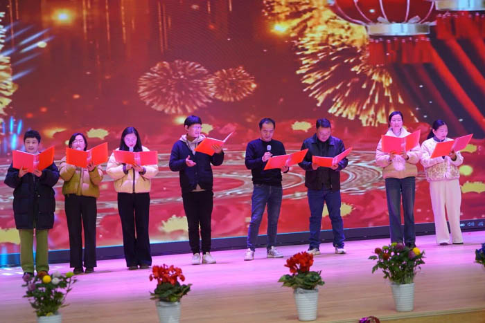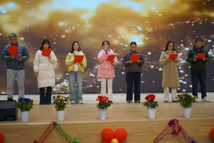 杨海云登台致辞。首先,他进行岁末回望,对三小全体教职工旧日里的教育教学岗位上的辛勤奋斗与无私奉献表示衷心感谢;其次,他分享教育心得,我们应继续保持对学生的仁爱之心、对教书育人的敬畏之心,继续