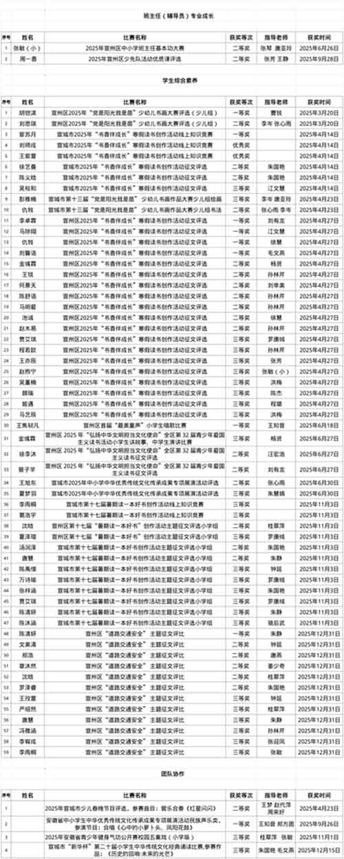 教师层面,班主任专业能力不断提升,张敏老师在宣州区班主任基本功大赛中荣获二等奖,周一香老师在少先队活动优质课评选中荣获二等奖,展现了德育队伍的专业素养。同时,朱国艳、杨贤、毛文燕、刘有龙、唐亚玲、王知音等一批指导教师在各类比赛中荣获优秀指导奖,形成了师生共成长的良好局面。