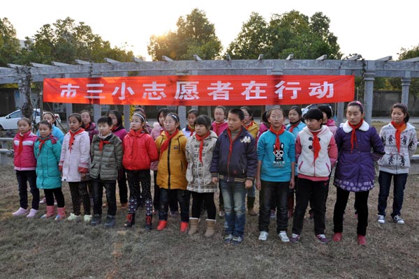 下午3时,在动员会上校长刘正厚作了发言,他说:“今天是国际志愿者日,通过你们的行动来传播‘学习雷锋、奉献他人、提升自已’的服务理念,把你们志愿服务精神的种子撒播到人们的心中。”动员会结束后,少先队大、中队干部们在敬亭苑社区广场打扫了草坪的卫生。
