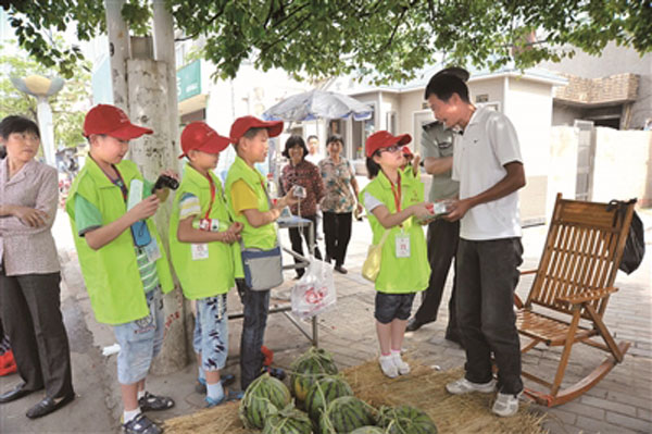 小记者给瓜农送去扇子和矿泉水。(小记者工作室提供)