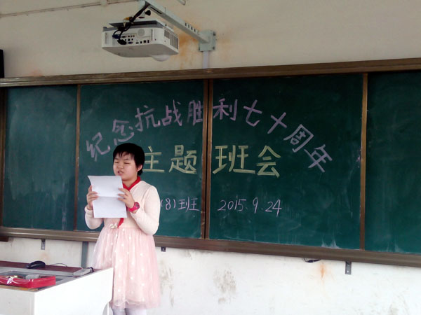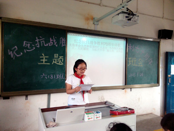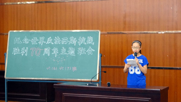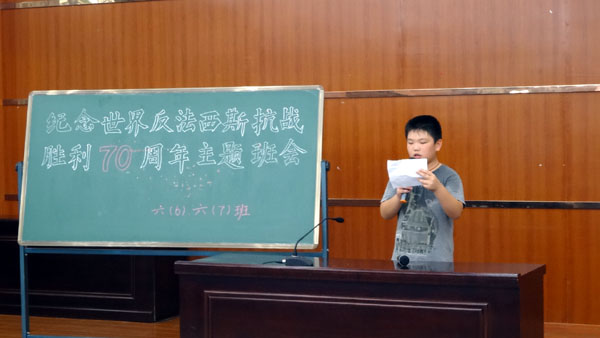 9月28日,市第三小学各班开展了“纪念抗战胜利七十周年”主题班会活动。 各班中队辅导员、中队长主持了此项活动,同学们发表了自己的看法,热烈的讨论了抗战胜利的意义。最后师生郑重宣誓:“勿忘国耻!抗战精神永存!”(文/崔好 图/杨华训 )