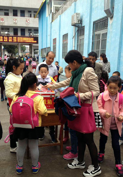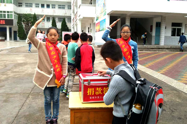 10月12日上午8时,一股股爱的暖流在市第三小学校园内涌动,全体师生为张弘毅同学、薛忠珊教师举行捐款活动。
