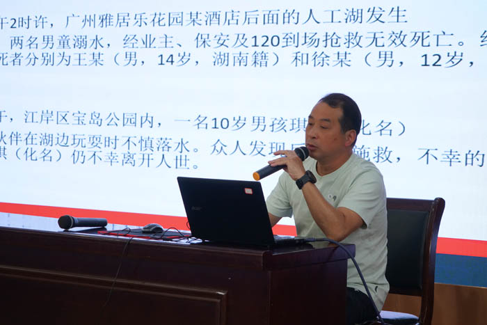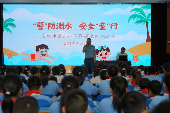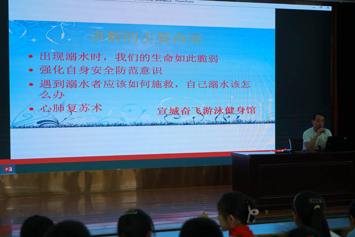 为进一步加强校园安全教育,增强学生防溺水安全意识,掌握防溺水知识技能,有效遏制学生溺水事故的发生,5月23日下午,我校特邀请宣城奋飞游泳健身馆教练、救生国家级裁判员、游泳救生员国家职业资格考评员、自然水域游泳救生员中级讲师徐光济为学生开展防溺水安全知识讲座。