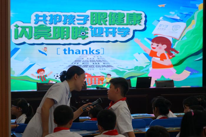 现场互动环节,学生踊跃抢答,积极参与,气氛活跃。随后,嵇主任还开展了“爱眼放松操”的现场教学,学生们一起快乐地学习眼部律动操,既保护视力,又放松身心。