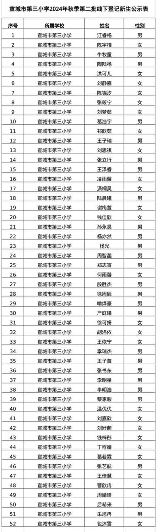 宣城市第三小学2024年秋季第二批线下登记新生录取名单公示表