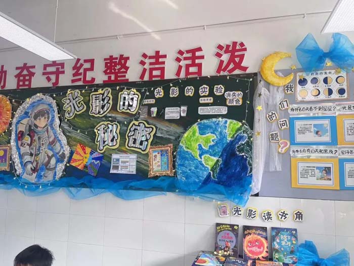 “光影秘境”博物馆是科学与艺术的梦幻联动。“光影的秘密”板块,宇航员、地球的创意装置,搭配“消失的颜色”等实验原理介绍,将抽象的光学知识变得直观有趣。“光影的魔法”区域,奇妙的影子、可爱的手影图解,还有同学们创作的星空、月夜主题手作,让光影的变幻如魔法般引人入胜。
