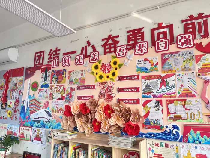 “红色教育博物馆”是一片热血沸腾的精神沃土。“长征五大精神”展区,以详实的路线图、战役介绍和感人故事,复刻了那段“万水千山只等闲”的峥嵘岁月;“革命英雄”板块里,刘胡兰等英烈的事迹被同学们以生动的手作和图文呈现,每一笔都饱含着对英雄的崇敬。“铭记历史”的红色标语下,一张张历史照片、一段段英雄事迹,串联起从革命年代到新时代的精神脉络;“我为祖国送祝福”的红色祈愿卡,写满了少年们对祖国的赤诚之心。在这里,长征的脚印化作精神的路标,英雄的故事成为成长的养分,让“团结一心
