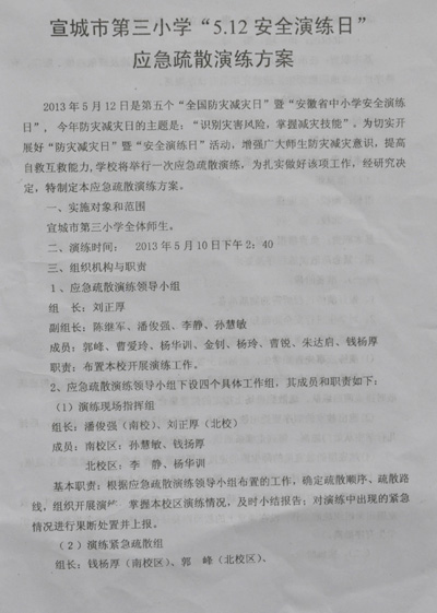 为开展好演练活动,演练之前,学校通过悬挂标语、广播、班会课等形式进行了大力的宣传;学校认真研究制定了安全可行的演练方案,成立了应急疏散演练领导组、现场指挥组、紧急疏散组、后勤保障组,方案对演练的时间、路线、内容、对象等都作了周密的部署,对这次演练的具体操作程序、疏散要求与注意事项作了细致地讲解。方案中教师分工明确,各负其责,保证了演练安全、有序地进行。