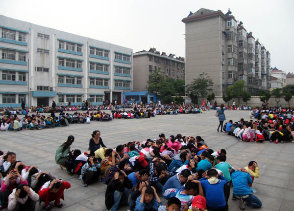 2时40分,随着警报信号响起,2700余名学生从教室撤离到大操场共花时1分40秒。整个演练过程紧张、有序、快速、高效。