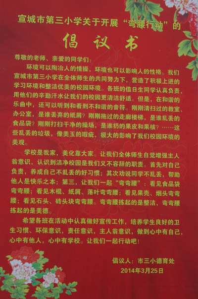 此次活动的开展,为学生提供了自主劳动实践的机会,培养了学生良好的卫生意识和劳动习惯,既净化了校园环境,也美化了孩子们的心灵。(杨玲)(本稿选登《皖南晨刊》2014年04月05日 网址http://epaper.xuanwww.com/wnck/html/2014-04/05/content_66373.htm?div=-1 )