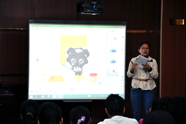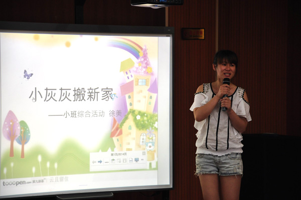 “我以小灰灰搬新家为线索……。”来自幼儿园的徐老师一边在屏幕上轻轻一点,一边解释着课件设计理念。“课件比较卡通,符合幼儿的特点,建议把背景上的字放大点。”“幼儿园不提倡教汉字,所以就放小了。”“你的录像课不仅要面向学生,还有面对评委的评定,评委不明白你为什么要这样设计?”多次担任全国交互式电子白板教学应用课例大赛的评委、培训老师杨英与徐老师交流着。