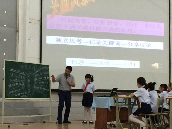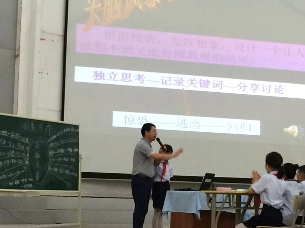 那个身材高挑、说着一口有点蹩脚的普通话的男老师叫冯志达,他是土生土长的香港人,是一位哲学博士,现致力于小学语文教学研究。他给我们呈现的是《包公审石头》的课例,他的课堂是开放的,学生一直在快乐中忙着表演,在快乐中收获着知识。他的“戏剧教学”和“循环涂鸦”教学环节,让在座的所有小学语文教师都耳目一新,也给我很多的教学启迪。