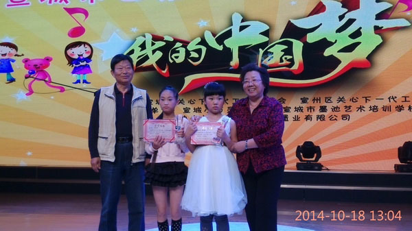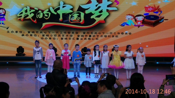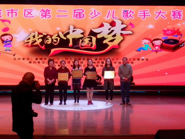 10月18日上午宣城市广电中心演播厅内歌声嘹亮、气氛热烈,由市、区关工委主办,市小百灵艺术团、市墨池艺术培训学校承办的宣城市区第二届“我的中国梦”少儿歌手大赛在这里举行。 市三小经校级选拔出的十二位小歌手全部通过了10月1日的预赛参加了此次决赛,并取得了好成绩。其中,应嘉鑫同学获一等奖;孙吉、桂雅文获二等奖;黄韵璞、杨宛奇、高思远、王子涵获三等奖;吴妙凡、张竹和、嵇承果、余旸、曹可欣获优秀奖。活动主办方还授予了市三小“优秀组织奖”。(文/杨华训 图/赵代萍)
