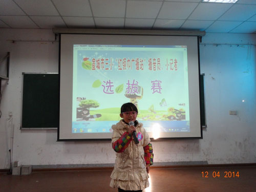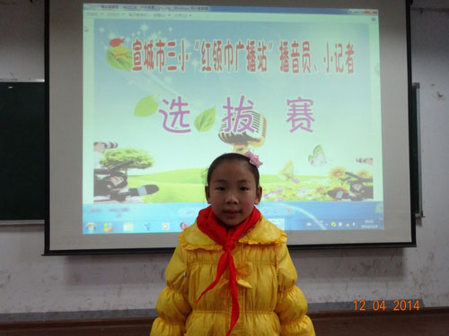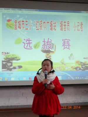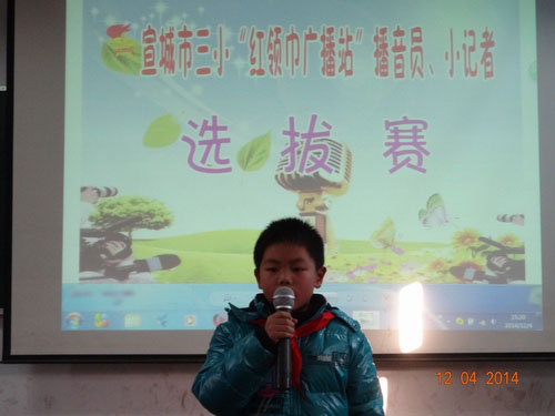 12月4日下午,市第三小学少先大队部举行了以“展现风采、放飞梦想”为主题的“红领巾广播站”播音员选拔赛。 本次活动得到了同学们的热烈响应和积极参与,经过班级初选,有44名播音员候选人参加本次比赛。面对评委老师,小选手们胸有成竹,大方自信地展示着自己的亮点。经过激烈角逐,最终12名同学脱颖而出,成为“红领巾广播站”的新成员。(杨玲)(本稿选登《宣州专刊 教体园地》3版 2014年12月15日)