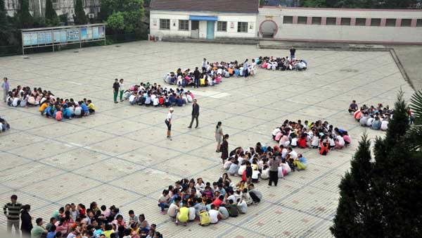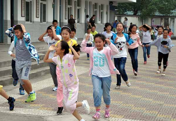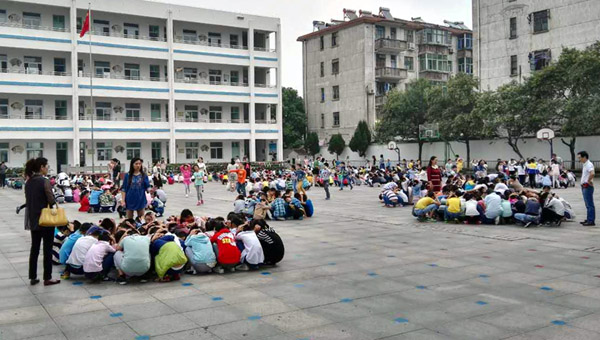 “用手抱住头部,不要拥挤。”……现场同学们相互提醒着,2300余名学生从教室撤离到大操场共花时1分58秒。