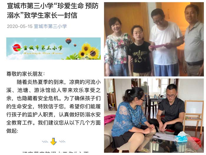为加强防溺水工作,5月18日——22日,市三小充分利用学校网站、班级家长微信群等平台发出“防溺水”倡议和宣传教育,要求各班召开一次“防溺水”主题班会并更新黑板报。同时,以防溺水为主要内容进行了留守儿童家访活动。在家访过程中,班主任老师向家长讲述“防溺水”的相关知识,叮嘱家长看护好孩子,提高安全防范意识,加强安全监管。通过一对一上门的方式,引起家长的高度重视,把防溺水安全工作切实做到位。